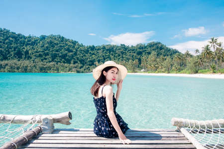 Asian woman tourists watching the sea view and admiring And the clear skies with beautiful clouds. Suitable for tourism, recreation and relax. at Koh Kood Thailand.