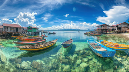 In a serene fishing village, colorful wooden boats are docked in a crystal-clear harbor, reflecting the vibrant blues of the sky and water during a beautiful day.