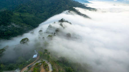 Aerial view of mist, blanket cloud and fog hanging over a lush tropical rainforest in the morning.