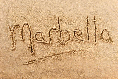 Sandy background with the word sand. Sand, beach, horizontal composition