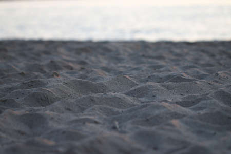 Sandy coast close-up against the background of sun glare of the sea. Narrow selective focus on sand and blurred background.
