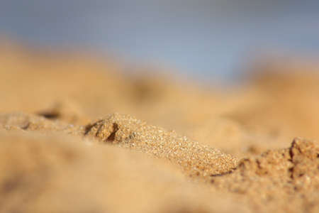 Close up of clean yellow sand surface covering seaside beach with blue sea water on background. Travel and vacations concept