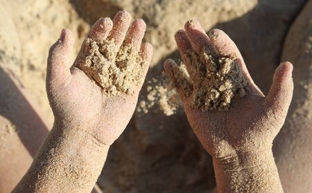 Hands holding sand on background of beach, carefree moment. Stylish young woman in sweater releasing sand on coast. Sand running through hands. Time concept. Summer beach and vacation