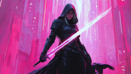 A beautiful woman in black leather armor and a hooded cloak, holding an electric sword, stands on the streets of neon-lit buildings. The background is a pinkish-purple hue with futuristic architecture, and she has long hair flowing behind her. She looks determined, as if ready to fight. This is a fantasy art style painting. --ar 53:30 --v 6.1 Job ID: 404e56aa-e163-4f88-a5ee-e63891529fc7