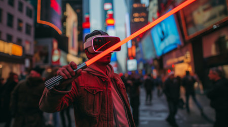 A man wearing virtual reality goggles in Times Square in New York.