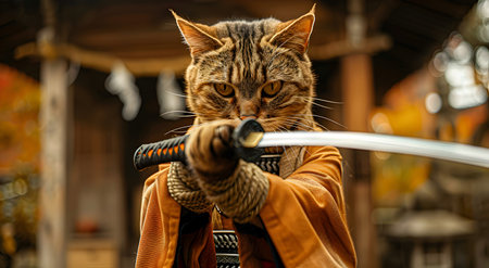 Portrait of a cat dressed as a samurai with a sword
