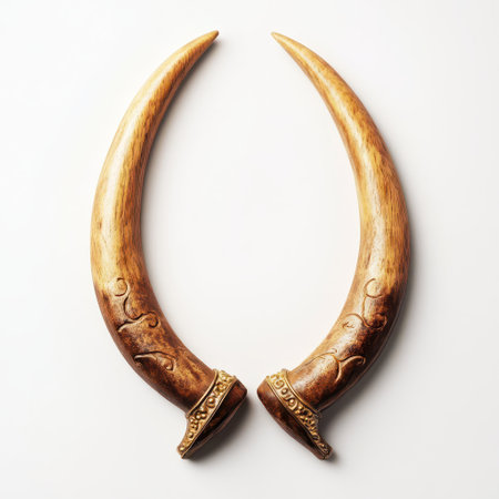 Two beautifully carved horns are displayed symmetrically on a light background showcasing fine craftsmanship and artistic details.