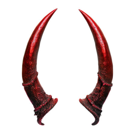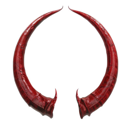 A pair of curved, shiny, red horns isolated against a black background.