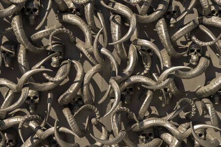 Scary skull and horns close-up with bones. Halloween