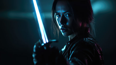 Female warrior with glowing sword preparing for a battle in dramatic lighting