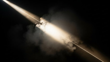 A bright laser beam cuts through smoke, creating a sharp line of light in darkness.