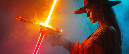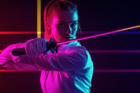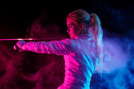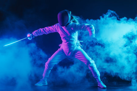 Dynamic fencing practice teen girl in costume wielding amid swordst neon smoke on black background