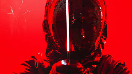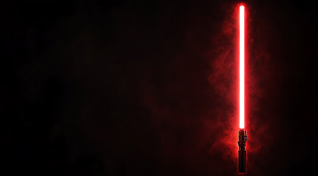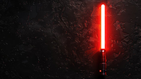 A vivid red light saber shines brightly against a cracked, dark textured backdrop, evoking sci-fi themes