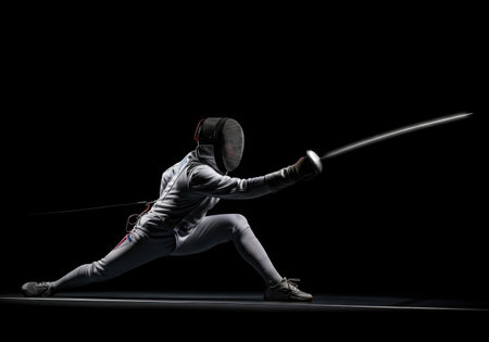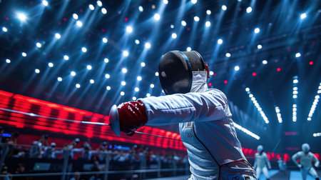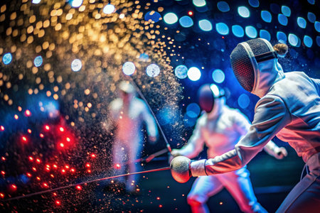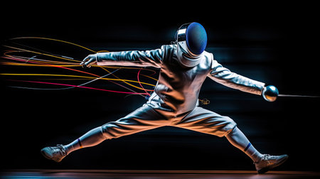 Fencer's rapid attack in vibrant high-energy hall