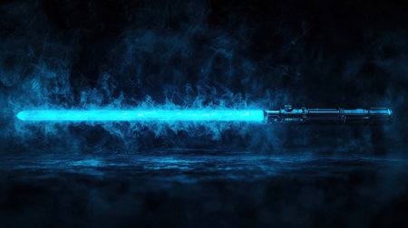 Illuminated blue lightsaber emits a captivating glow while surrounded by swirling smoke against a dark background, ideal for fantasy and sci-fi visuals.