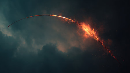 This image features a stunning fiery arc cutting through dark clouds, creating a mesmerizing visual that portrays energy and motion in a dramatic atmosphere.
