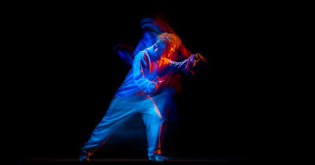 Astonished man, hip-hop dancer in sportive style clothes dancing isolated on dark background at dance hall in mixed neon light. Youth culture, hip-hop, movement