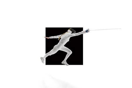 The dynamic motion of an athlete captured in a high-speed photograph. Female fencer in motion, training over white background with black element.