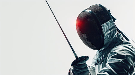 Fencer wearing protective mask and uniform, extending foil forward. Sport and determination concepts are shown