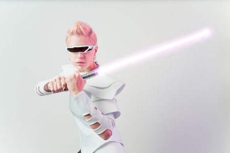 Cyberpunk world. Militant cyberpunk warrior in a protective suit fights with a sword in his hands in neon light. Game, virtual reality.
