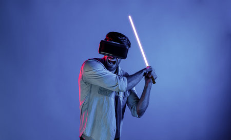 Caucasian man wearing VR glass and moving gesture holding sword. Gamer using future digital virtual reality headset or futuristic innovation to enter meta world or playing action game. Deviation.
