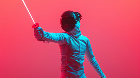 Fencer in glowing gear striking pose with sword, futuristic illuminated suit and mask, symbolizing technology in sports
