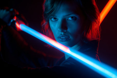 In a dark environment, a strong fighter brandishes two glowing lightsabers with vibrant blue and red colors.