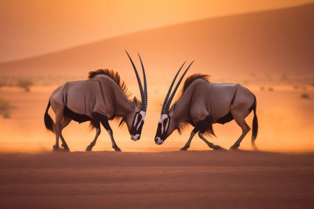 Two oryx fighting in the desert at sunset in the desert in Africa.