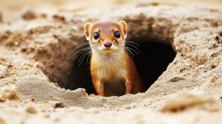 A charming weasel peeks out from its sandy burrow, exhibiting curiosity and alertness in its natural habitat. This captivating wildlife moment highlights the unique personality and agile nature of this small mammal.