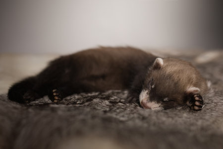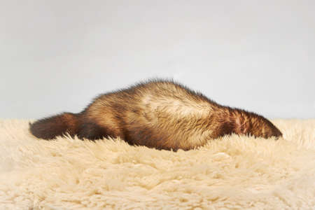 Ferret five weeks old baby posing for portrait on rabbit fur