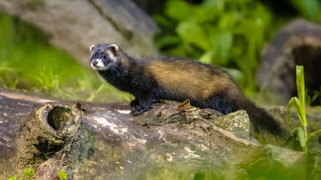 Polecat (Mustela putorius). European polecat on trunk in forest background at night under natural nocturnal circumstances. Wildlife scene in nature of Europe.