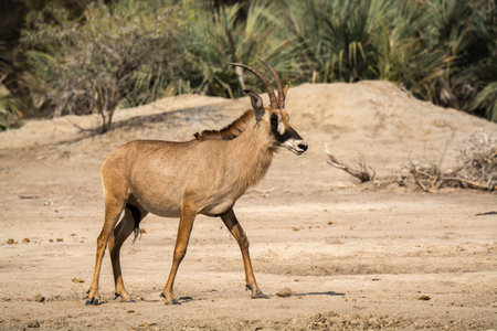 Sable antelope stands on sand in profile