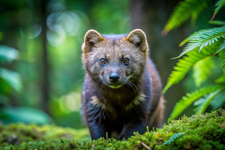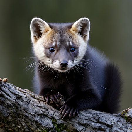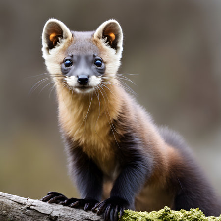 Pine marten, a small mammal, looking directly at viewer while standing on a moss covered fallen log in its natural forest habitat, highlighting wildlife and nature