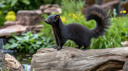 A small black animal is positioned on a log close to a stream, observing its surroundings. Lush greenery and flowers create a vibrant natural backdrop, highlighting the animal's features