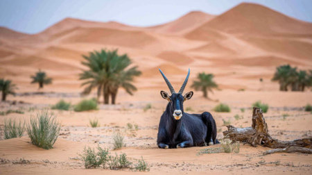 A majestic black oryx lying down in a desert with sandy dunes and sparse vegetation.