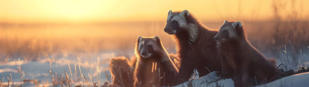 Wolverine family walking towards the camera in the forest with setting sun. Group of wild animals in nature. Horizontal, banner.