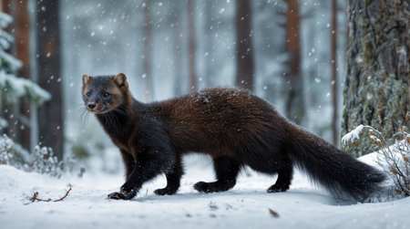 A sable Martes zibellina standing in a snowy forest surrounded by snow-covered trees and falling snowflakes, showcasing its dark brown fur, lighter patches near the ears, and natural winter habitat.