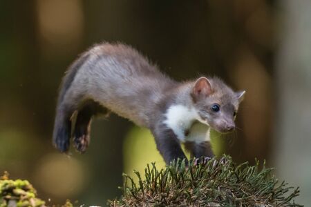 Stone marten, Martes foina, with clear green background. Detail portrait of forest animal. Small predator sitting on the beautiful green mossy tree trunk in the forest.