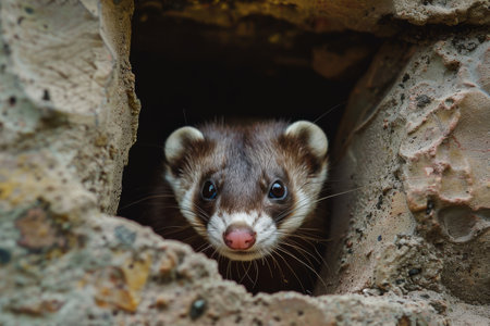 A ferret peeks out from beneath a wooden structure, embodying its playful spirit and natural curiosity, A playful ferret peeking out from a hiding spot, Ai generated
