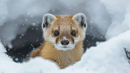 A cute animal peeking out from snow with snowflakes falling, capturing a moment of curiosity and playfulness