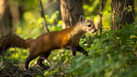A small brown American marten is captured in its natural habitat, walking through a lush forest filled with trees and vegetation.