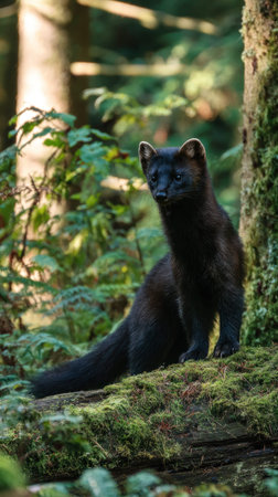 A sable silhouette stands gracefully on a moss-covered log, surrounded by vibrant foliage and dappled sunlight, creating a peaceful atmosphere in the tranquil forest setting