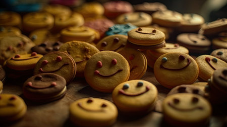 Homemade cookies with smiley faces on a wooden table, close up