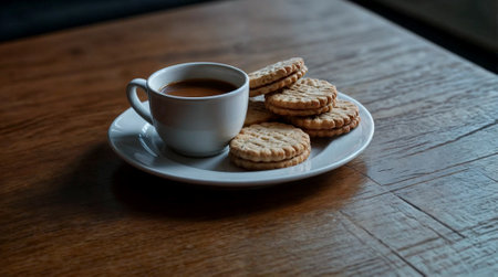 Plate of cookies and cup of coffee on wooden table in living room. Generative AI