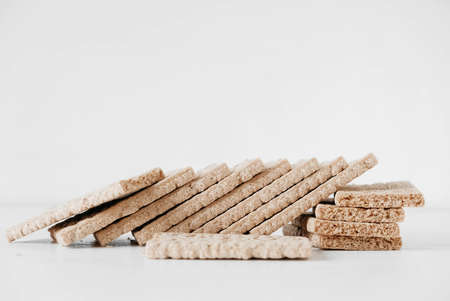 Stacked rye crisp bread on a white wooden background. Copy, empty space for text.