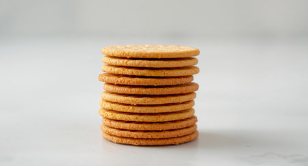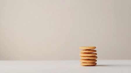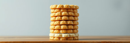Stacked cookies arranged neatly on a wooden surface against a light background