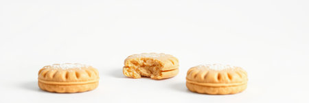 Delicious cookies arranged with one bitten in a bright setting