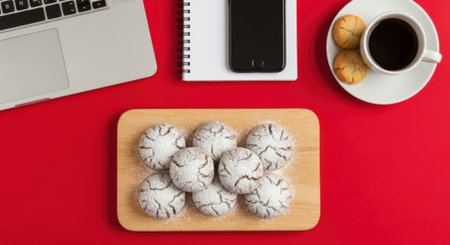 A flat lay of cookies on a wooden board, coffee, a laptop, and a phone on a red surface.