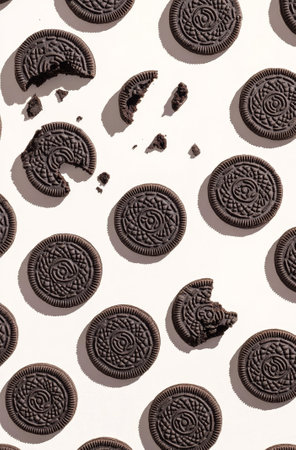 A tempting assortment of chocolate cookies is artistically scattered, showcasing bites taken out and crumbs sprinkled on a clean white backdrop.