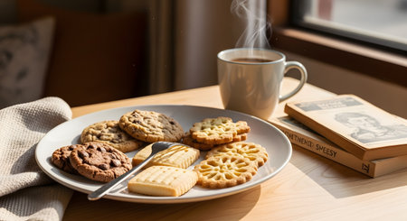 A relaxing scene with a plate of assorted cookies, a steaming cup of coffee, and vintage books on a wooden table. Sunlight streams in, creating warm shadows and a cozy reading atmosphere.